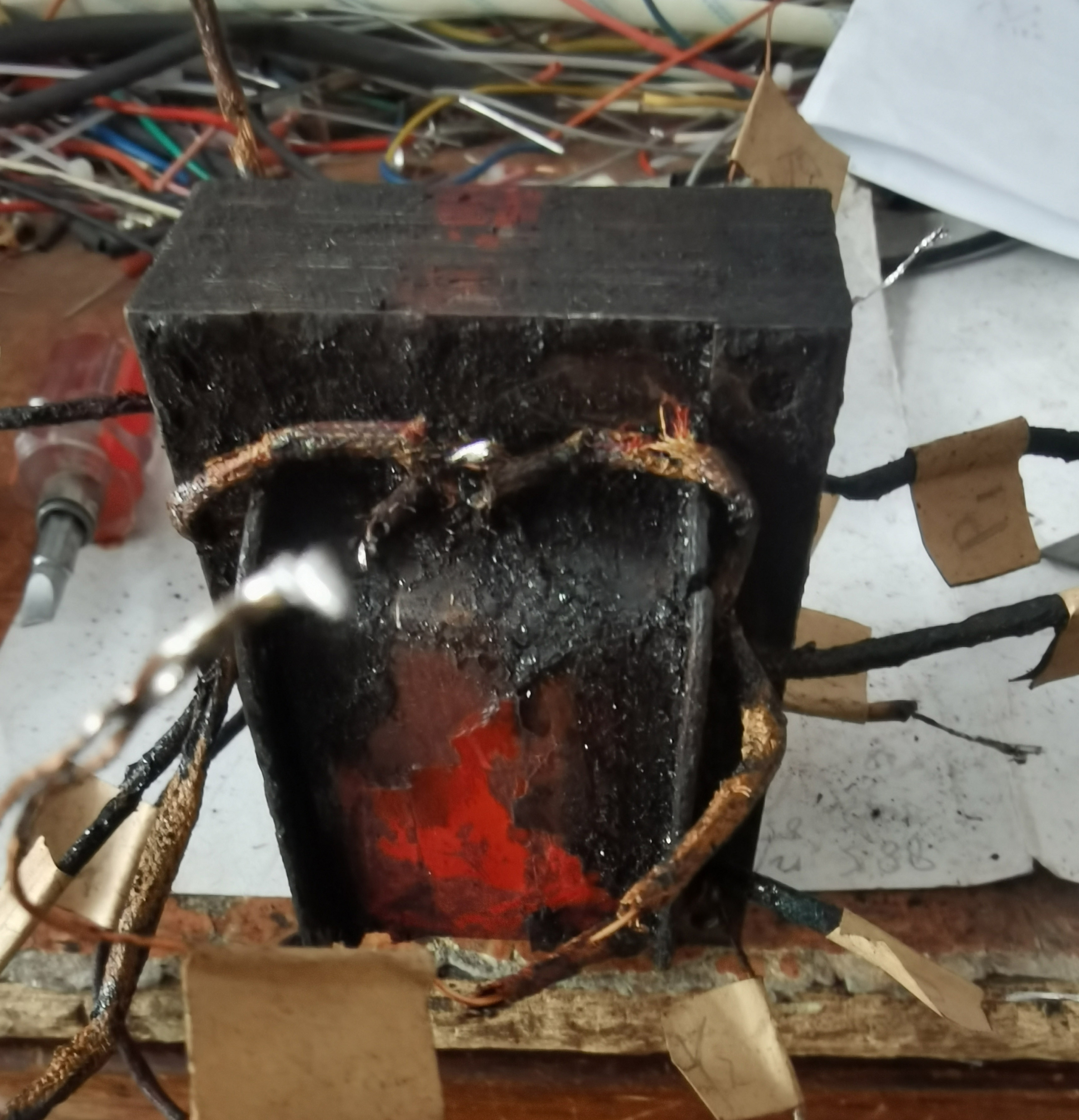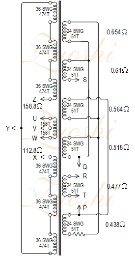 这个几十圈的小线绕电阻,是做什么用的呢?接线图见上图。紧贴在线包的外侧,好像是温度保险一样。根据接线图,串连在第一段次级的首端。经过分析,我认为这个小电阻,主要作用就是均流保护(就像并联管子有均流电阻一样),因为第一段次级紧靠内圈,绕组内阻比较小,加上内圈散热不好,容易引起恶性循环导致整体变压器出现问题。,可以想像发热是肯定的。